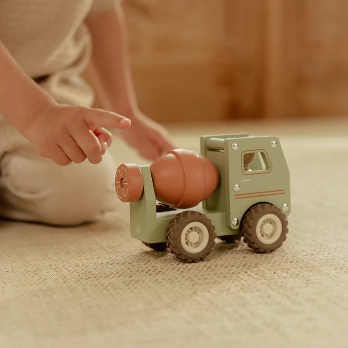 Mix and build! This wooden cement truck spins its mixer while driving around the construction site. The mini cement mixer comes with a wooden construction worker and has rubber wheels for extra driving comfort. Drive to the construction site, pour out the concrete, and smooth out the roads completely.
